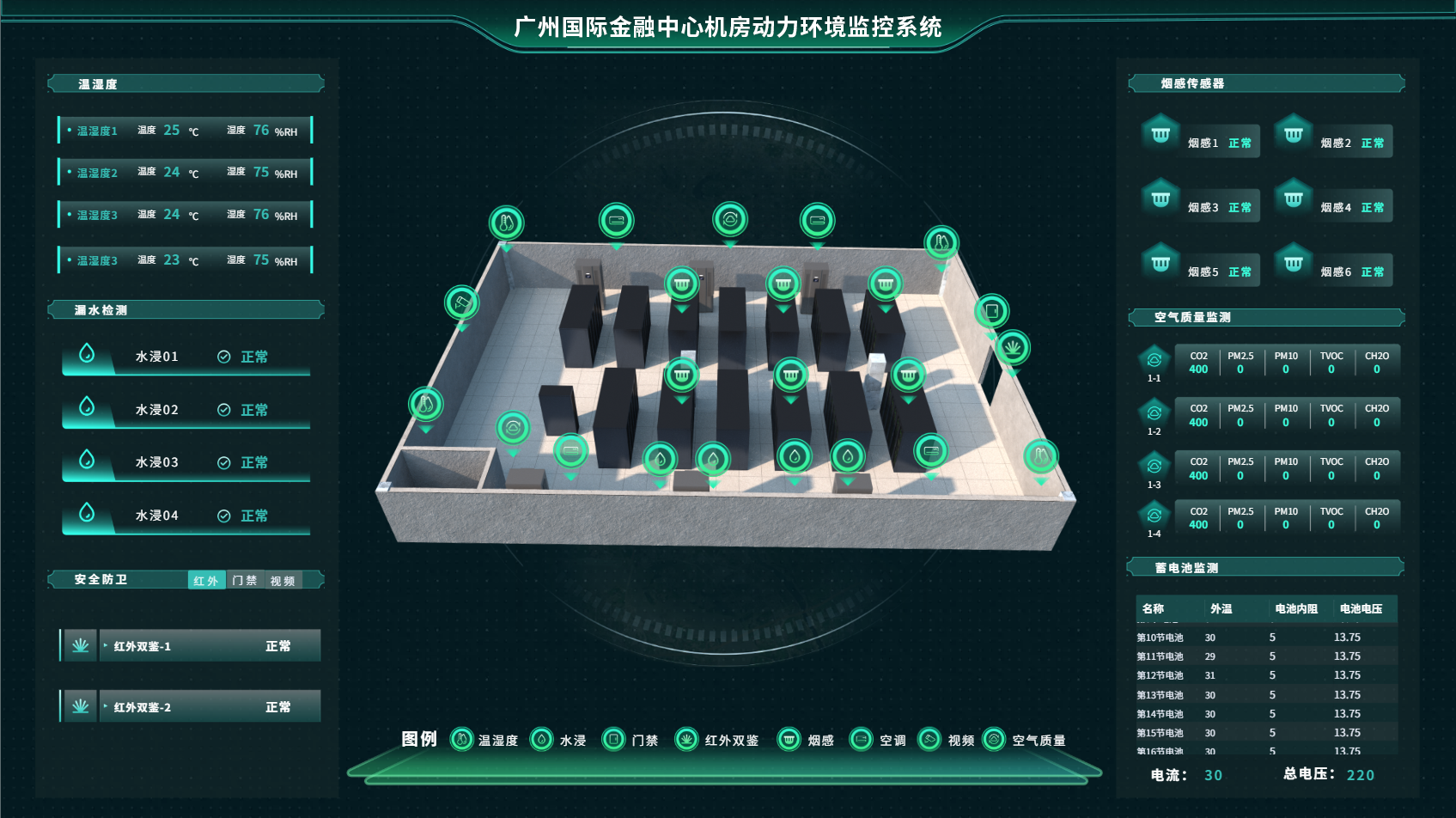 供配电系统:输入/输出电压、电流、频率、功率因数,UPS状态、电池组充放电时长、剩余电量,柴油发电机启动状态、油位、水温,配电柜开关状态、漏电报警。