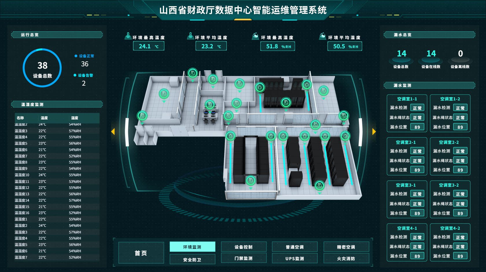 为保障财政业务连续性和数据安全,山西省财政厅需建设智能化动环监控系统,实现对机房动力、环境及安防的全面管控。方案采用分层架构,通过传感器实时采集UPS、空调、温湿度、漏水等数据,经物联网技术传输至管理平台,提供可视化监控、智能告警及远程运维功能。