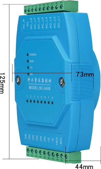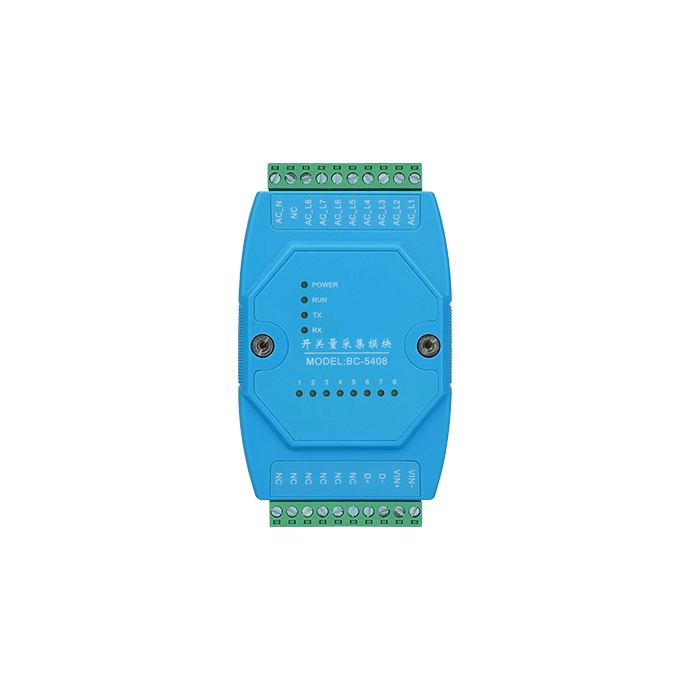 市电开关状态监测模块(8路)可以用于采集(150~240V)交流开关量(市电)信号,主要用于机房监控、工业控制或其他分布式数据的采集。上报接口采用RS485通讯总线及标准MODBUS RTU通信协议,可以很方便地集成到第三方的应用系统中。