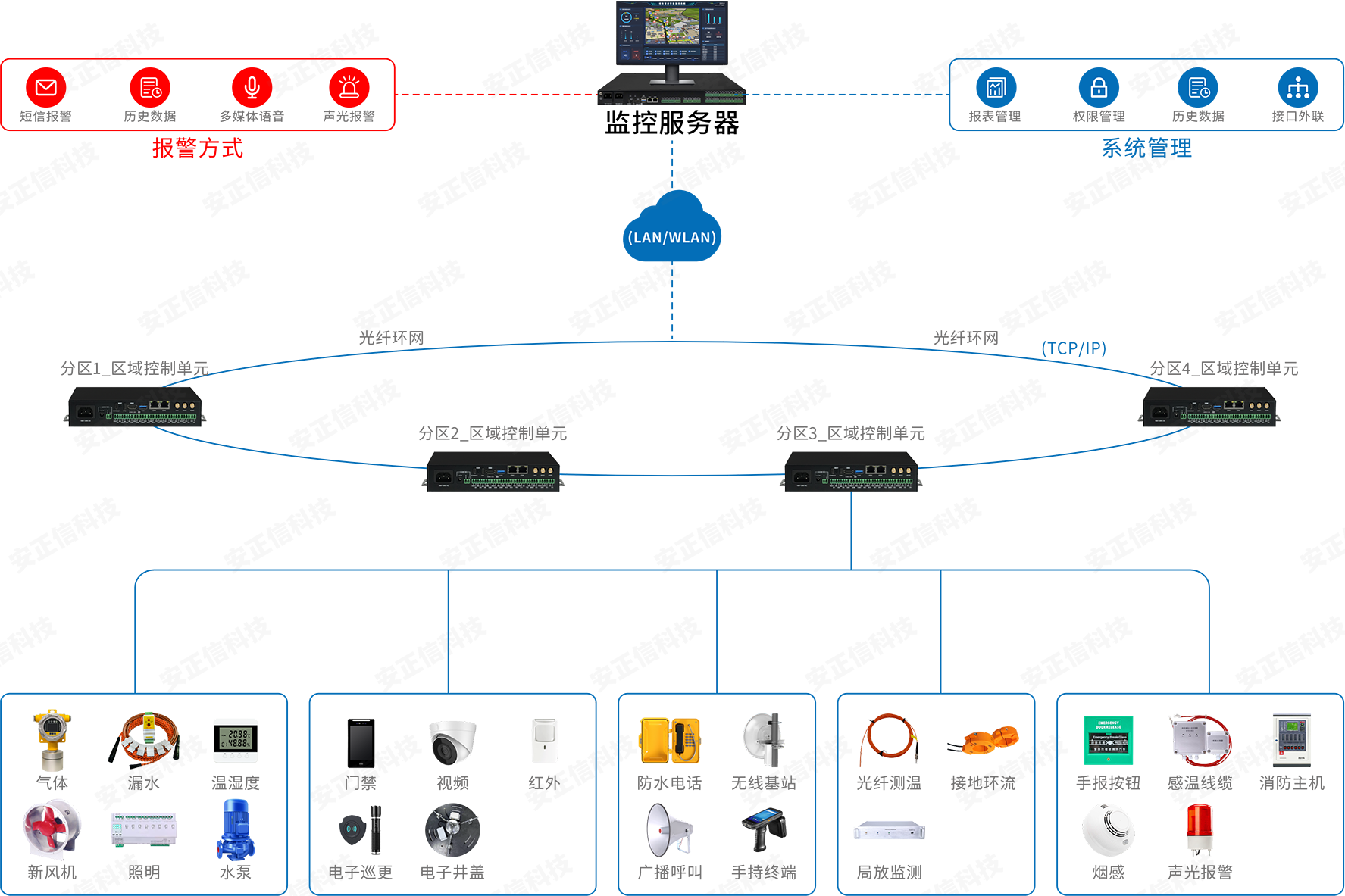 各子系统通过光纤环网传输数据,提高数据交换与系统联动效率。系统支持远程控制,本地离线运行,即使通讯中断也不会影响本地联动控制;