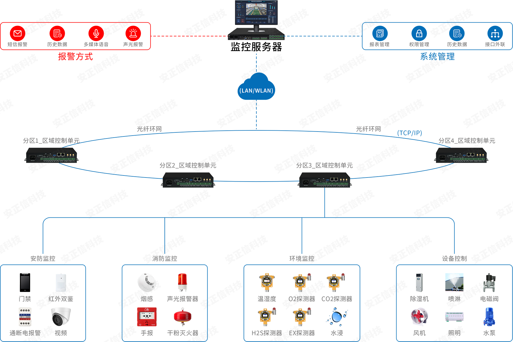 环境设备:温湿度、O2探测器、CO2探测器、H2S探测器、EX探测器、水浸......