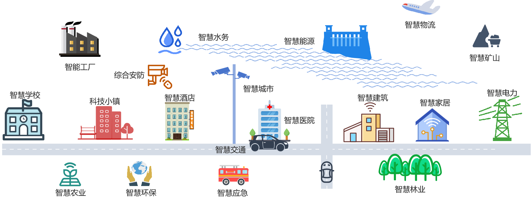 智慧水务、智慧能源、智慧物流、智慧矿山、智慧电力、智慧家居、智慧建筑、智慧医院、智慧交通、智慧城市、智慧应急、智慧林业、智慧环保、智慧农业、智慧学校、科技小镇、综合安防、智慧酒店、智能工厂。